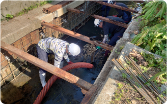 などの清掃 - 定期的な清掃を行い、きれいな街と水を保ちます。公共事業が多いですが、工場内の側溝や調整池・沈砂池などの清掃もお任せください。