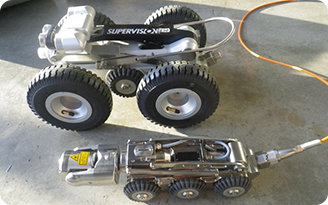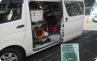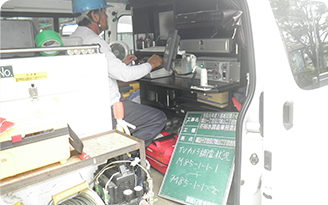 (本管・取付管) - 普段は見えない下水管・雨水管の中を自走式のTVカメラを走らせて調査します。車の中でコントローラやタッチパネルを使っての作業です。新設管の竣工時の調査や、既設管の老朽化調査、また、つまりが発生している管の中を確認することもできます。専門の資格を持ったオペレーターが管の異常を見逃すことなく記録し、全体の映像も録画します。小さな管(φ150)から大きな管(φ800)までさまざまな管の調査が可能です。(φ800を超える大口径は目視調査となります)