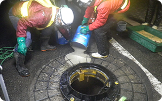 ・ピット清掃 - 飲食店のグリストラップから大型のピットまで、高圧洗浄車と強力吸引車を使用して油脂や汚泥など堆積物を取り除きます。グリストラップも定期的な清掃が大切です。怠ると油脂などが固まり、つまりの原因になります。また、工場内などの地下深いピットでもパワーのある強力吸引車で汚泥や土砂など汚れを取り除くことができます。